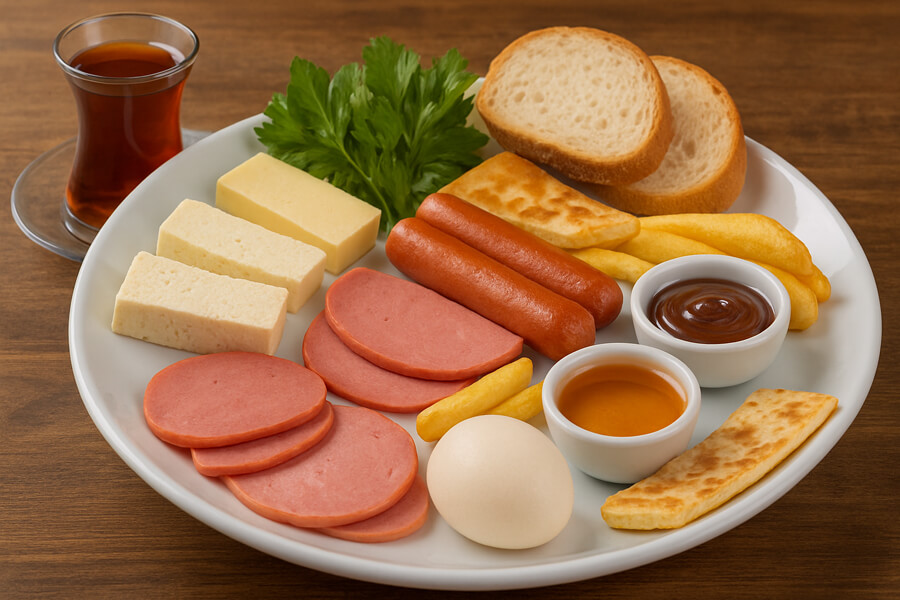 White Cheese, Tulum Cheese, Aged Kashar Cheese, Fresh Kashar Cheese, Labneh, Fresh Greens, Salami, Sausage, Turkey Ham, French Fries, Honey Butter, Nutella, Boiled Egg, Gozleme, Bread, Unlimited Tea