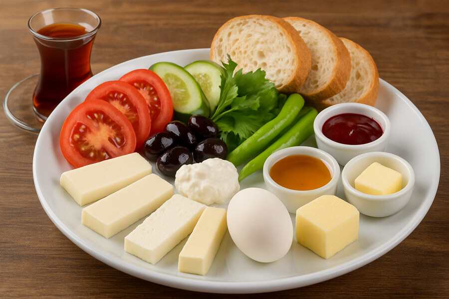 White Cheese, Kashar Cheese, Labneh, Olives, Tomato, Cucumber, Pepper, Fresh Greens, Jam, Honey, Butter, Boiled Egg, Bread, Unlimited Tea